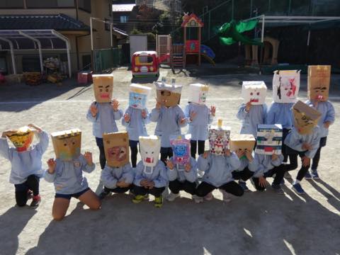 今日は地震を想定した避難訓練。園児たちは防災頭巾をかぶり、水筒をもち落ち着いて避難できました。